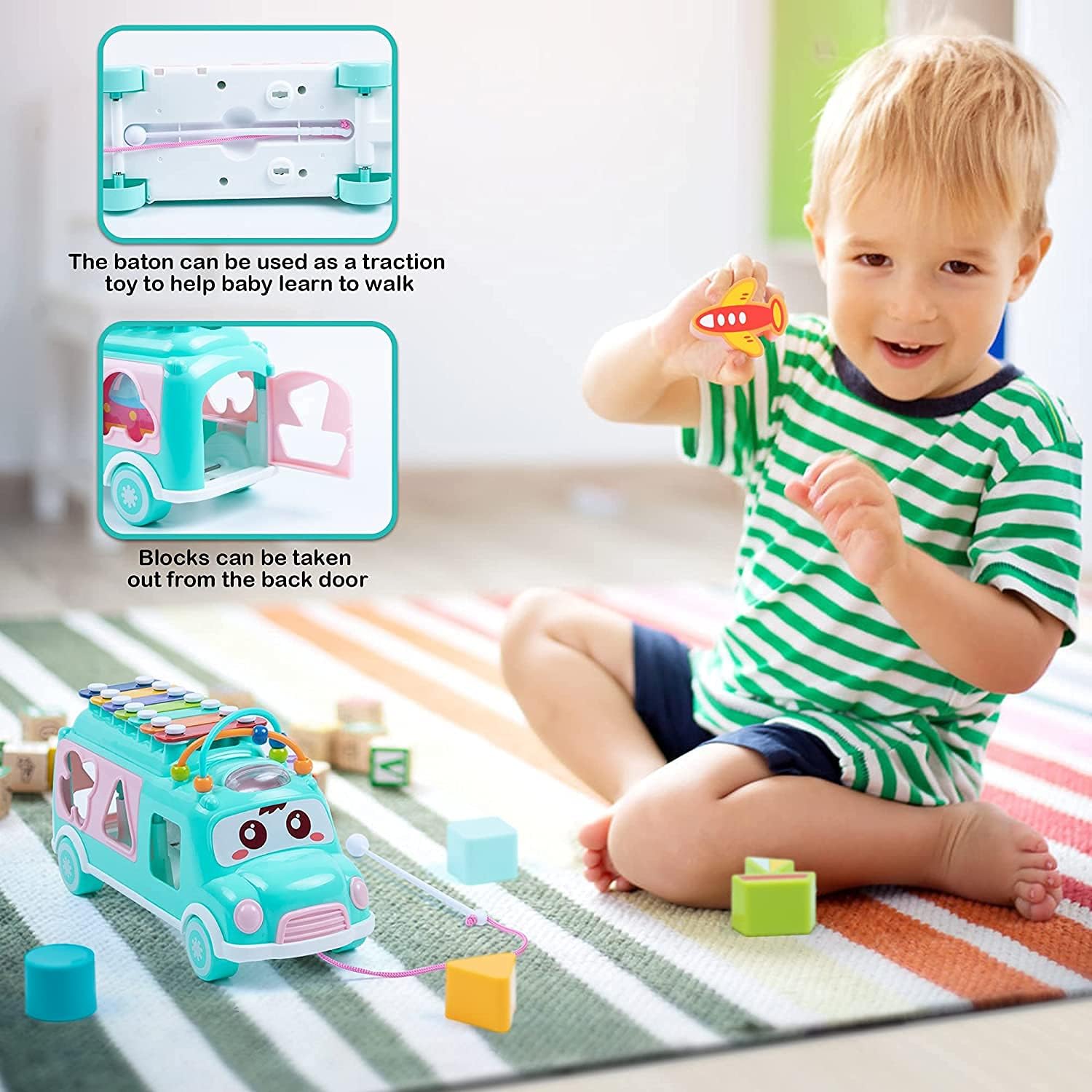This multifunctional toy features a xylophone, shape sorter, push & go vehicle, and abacus for endless educational fun. It boosts cognitive skills, hand-eye coordination, counting, and rhythm while keeping kids engaged with its bright colors and friendly face. Made from durable, non-toxic materials, it’s safe, easy to handle, and perfect as a gift for toddlers.
