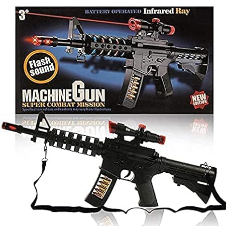 Durable ABS plastic machine gun with flashing lights, shooting sounds, and vibration. Includes scope and stand. Battery-operated fun for kids 6+.