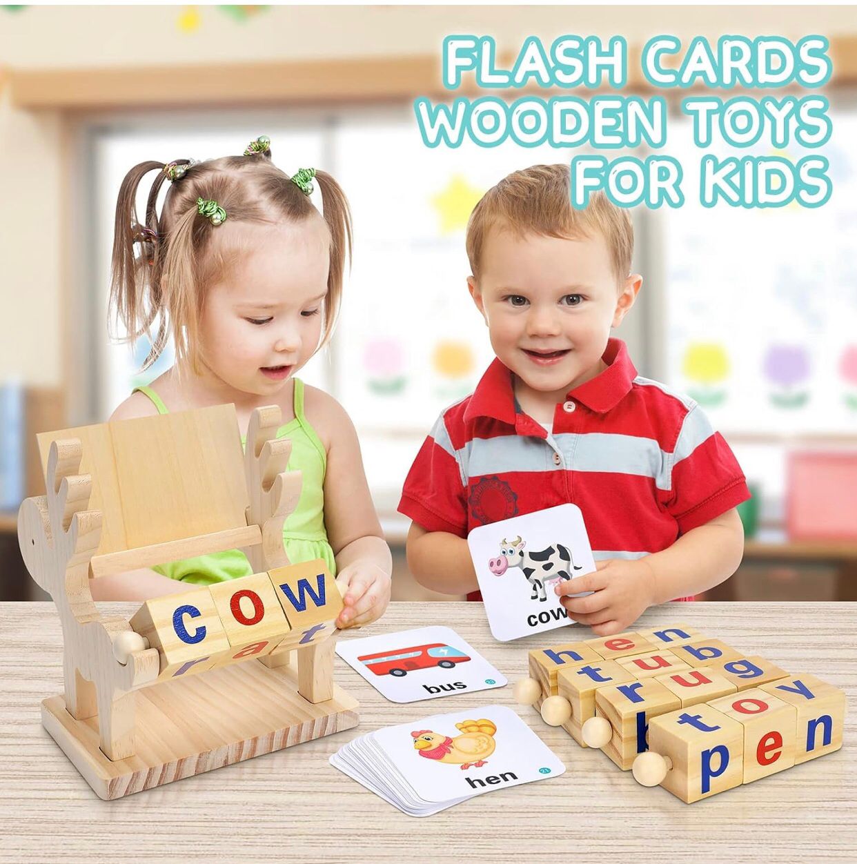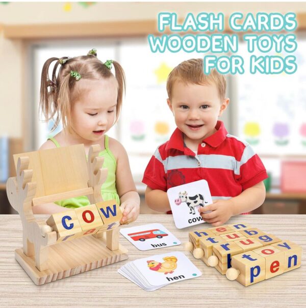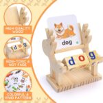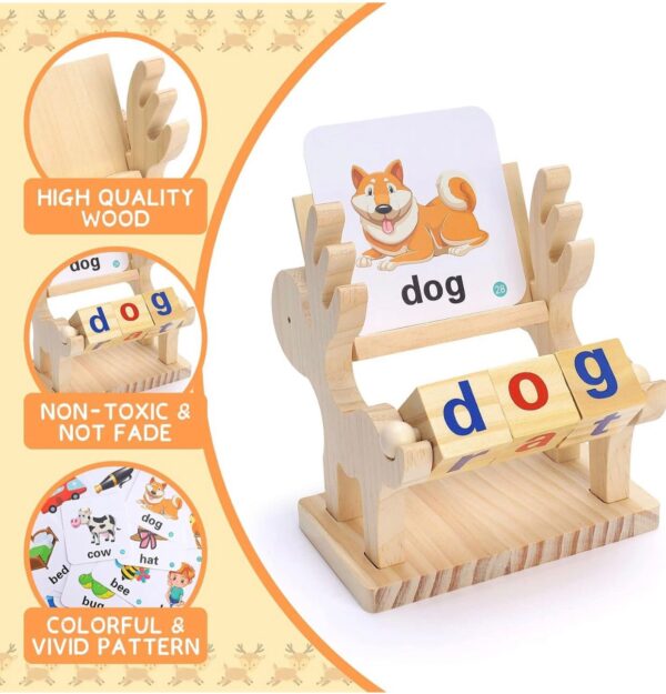 Wooden spelling toy with word cards helps kids learn letters, words, and reading skills.