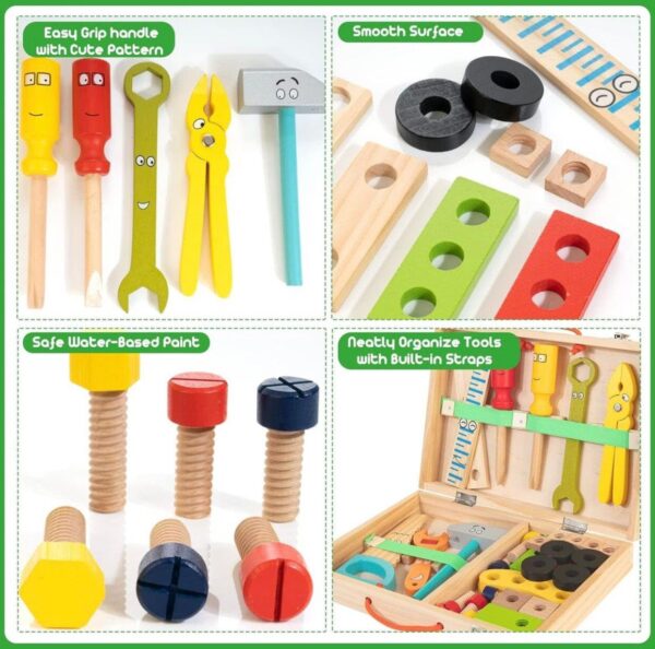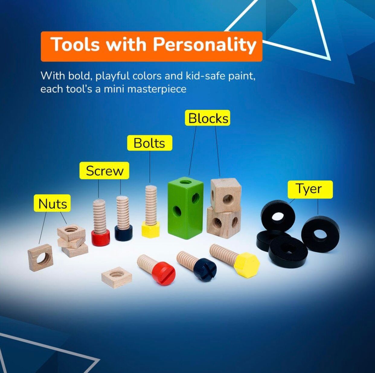 Engaging wooden tool kit with colorful pieces to inspire creativity and imaginative building play.