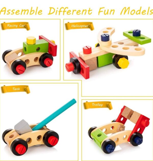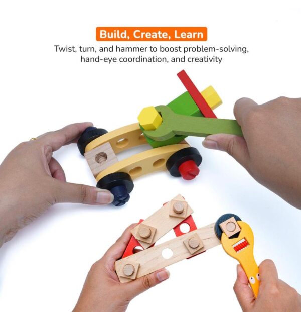 Designed to improve fine motor skills, problem-solving, and hand-eye coordination, it allows children to assemble cars, shapes, and unique models while learning basic tool-handling skills in a safe way. Crafted from eco-friendly, non-toxic wood with smooth edges, it’s completely child-friendly and durable for long-term use.